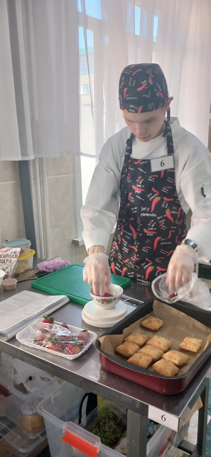 Первыми в борьбу за золото чемпионата вступили повара. 15 апреля на базе Высшего строительно-экономического колледжа сошлись лучшие представители данной профессии. Наш колледж представлял Солодников Вадим, студент 3 курса, группы П-22, ученик мастера производственного обучения Щелупа Ольги Владимировны. Будущие мастера большой кухни состязались в двух модулях – «Говядина «Веллингтон» и «Десерт». В условиях серьезной конкуренции Вадим показал блестящие навыки и знания, став обладателем медальона отличия World Skills-СКО-2025.